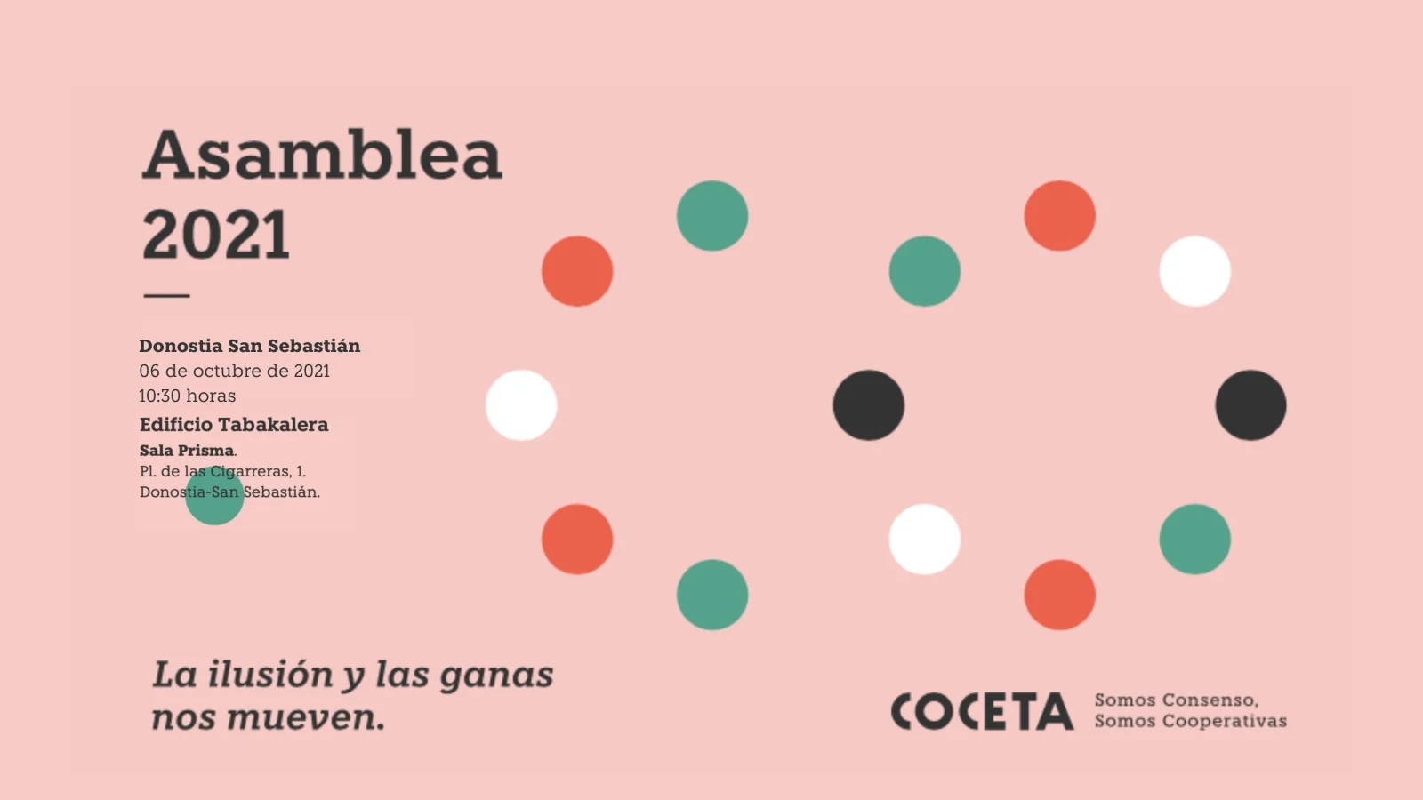 Es por lo anterior que la Asamblea General de COCETA 2021 (6 octubre. 10:30 -13:30 horas. Sala Prisma. Edificio Tabakalera) ha incrementado su condición de “especial”, toda vez que ya era el primer evento presencial de la confederación desde el inicio de la pandemia. Asimismo, es la primera Asamblea física en la nueva etapa emprendida en 2019, bajo la presidencia de Luis Miguel Jurado, junto a su ejecutiva. Como en toda Asamblea, se trasladará la memoria de lo realizado en el último año y se proyectarán los retos del próximo, pero en un ambiente de reencuentro para la que se ha diseñado una imagen específica, y que cuenta con colaboración de KONFEKOOP, la socia territorial de COCETA en País Vasco e inestimable anfitriona. El lema de la Asamblea, que se podrá seguir por streaming (www.coceta.coop), es “La ilusión y las ganas nos mueven”.